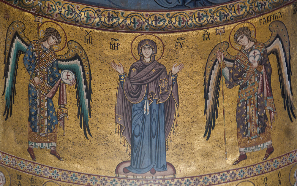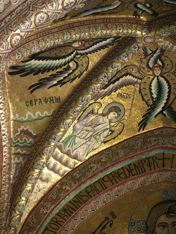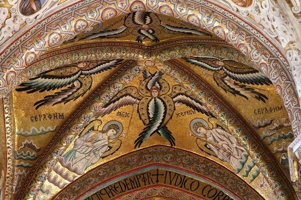Мозаики апсиды в Чефалу, выполненные в чисто византийском стиле, занимают ключевое место в формировании сакрального пространства храма. Золотой фон, строгая симметрия и возвышенные лики ангельских сил создают характерную для византийского искусства атмосферу небесной торжественности.