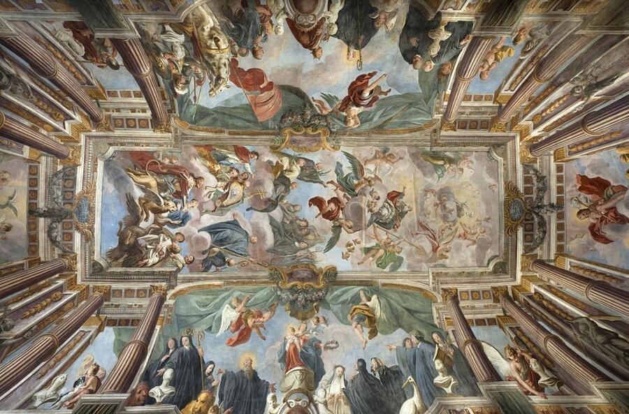 Особенно заметно историческое наслоение в интерьере: барочные росписи и мраморные алтари XVII–XVIII веков соседствуют с византийскими мозаиками, формируя многослойный образ храма.