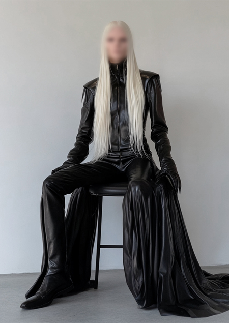 — full-body shot of an androgynous male model with very long blonde hair, wearing a black leather trench coat and sitting on a chair in the middle of a white room.