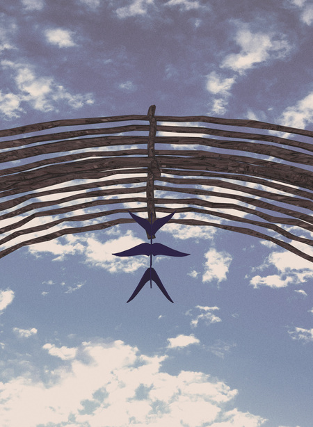 Меж двух холмов вырастает арка-портал, ведущая в гости к птицам. Она становится символом соединения между человеком и природой, мостом между двумя мирами, которые могут существовать в гармонии друг с другом.