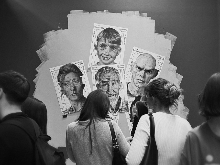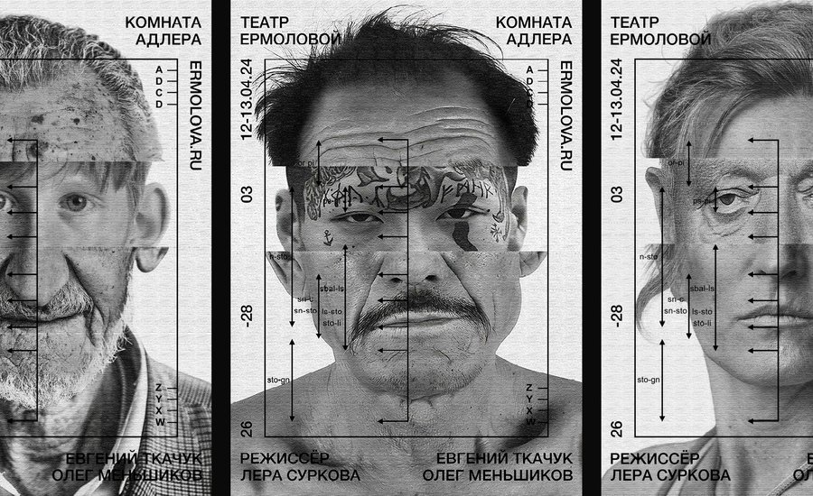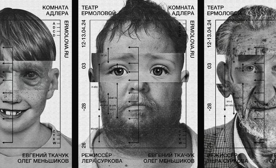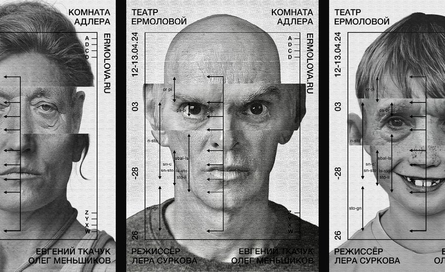 The series of theatre posters is dedicated to the production of the «Adler Room» of the Ermolova Theatre. Each work is an individual, gathered from a variety of strangers who live in a major hero suffering Dissociative personality disorder. Repertoire "The Adler Room" - Official website