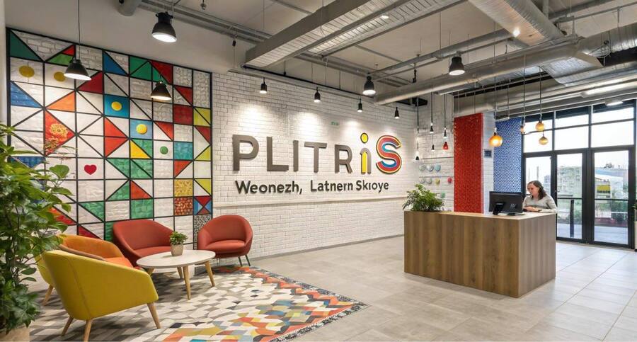 1. Create a modern, open-plan office for Plitris, a tile and construction tools brand. The space features high ceilings, exposed concrete, large windows with city views, and bright natural light. The interior combines industrial elements with colorful tile-inspired accents. A bold Plitris logo is displayed on a white feature wall. Workstations are organized symmetrically with light wood desks and white partitions. Pops of color appear in wall decor and design samples on tables, echoing the brand’s focus on craftsmanship and creativity. The style is clean, professional, and visually tied to architecture and design.