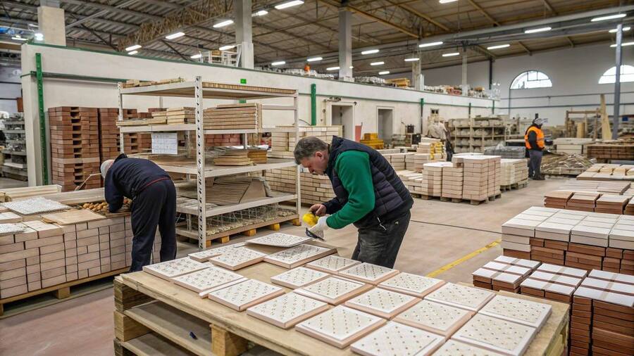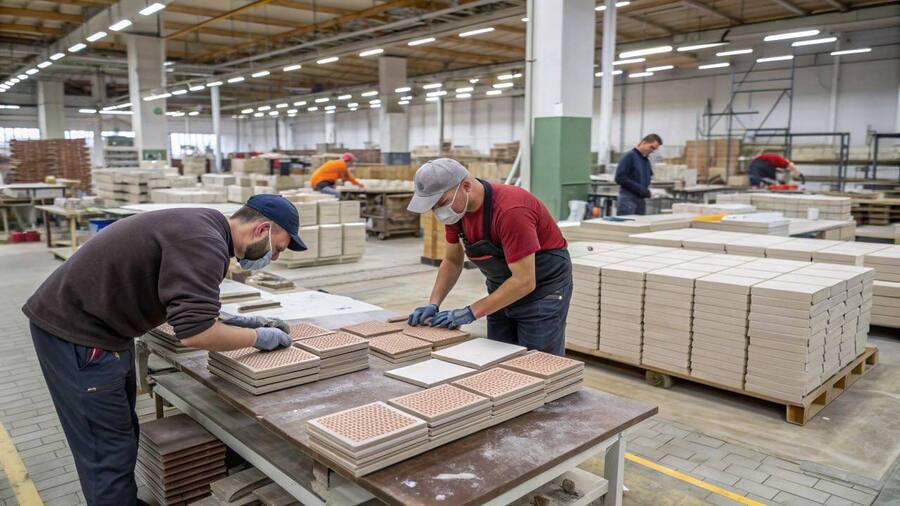 3. Create an industrial tile production workshop for Plitris, a brand specializing in ceramic tiles. The space is large and well-lit, with high ceilings, bright LED lighting, and organized workstations. Workers in uniforms and protective masks are carefully assembling and inspecting tiles on large worktables. Surrounding the area are stacks of raw and finished tiles on wooden pallets. The environment is clean, spacious, and efficient, with a strong sense of craftsmanship and precision. Style is realistic and functional, conveying the scale and detail of a high-quality tile manufacturing process.