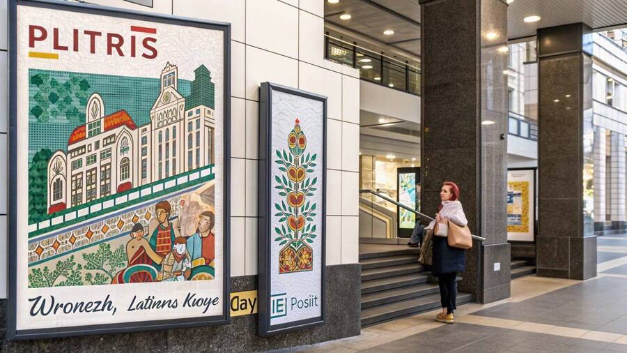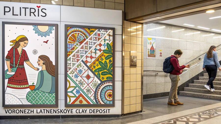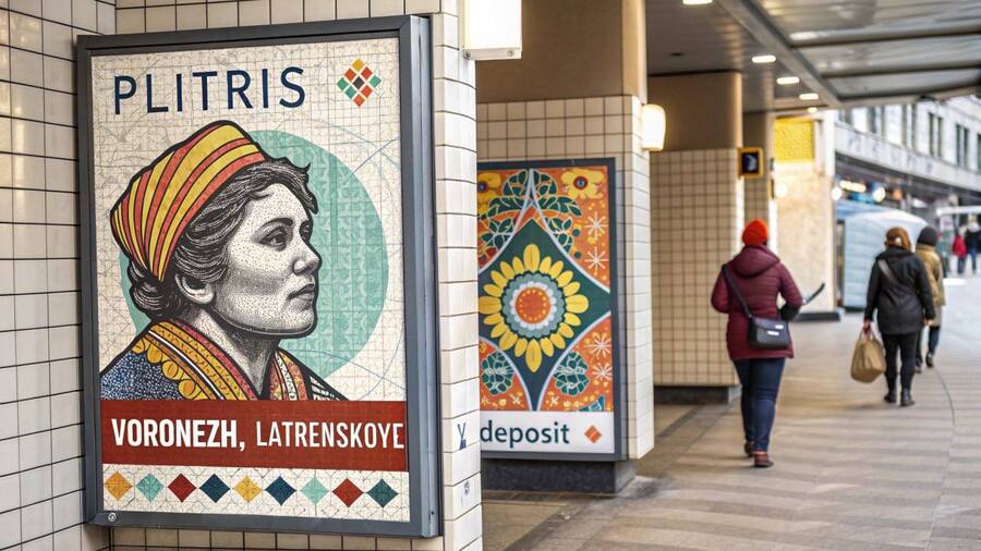 1. Create a street advertising poster for Plitris, a tile brand inspired by traditional and folk aesthetics. The poster features a stylized portrait of a woman in traditional Eastern European attire, illustrated in a vintage, dot-shading style reminiscent of woodcut prints. The background has tile textures and symmetrical decorative patterns. The branding is bold and modern, with the Plitris logo and a location tag reading «Voronezh, Latrenskoye». The scene is set in an urban street environment, with tiled walls, people walking by, and ambient city lighting. The style combines modern urban design with folk-inspired art.