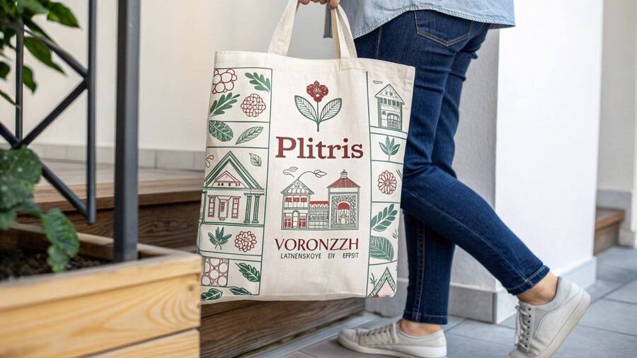 6. Create a person holding a stylish cotton tote bag featuring a vintage-style illustration. The tote bag has the word «Plitris» in bold serif font and the phrase «Voronezh Latienskoye» below it. The design includes traditional, hand-drawn architectural elements such as houses with ornate roofs and pillars, alongside botanical motifs like leaves and flowers in green and red. The person is casually dressed in blue jeans and sneakers, walking indoors up tiled stairs. The scene is cozy, bright, and designed in a minimal, Scandinavian-inspired aesthetic with wooden and white elements.