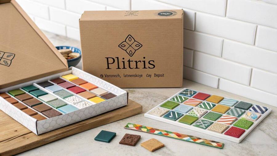4. Create a neatly arranged ceramic tile sample kit on a light kitchen counter with white subway tile backsplash. A cardboard box with a minimalistic black logo reads «Plitris» and includes the text «Voronezh, Latinenskoye Clay Deposit.» The open box reveals a grid of colorful ceramic tile samples, arranged by tone from earthy browns to greens, blues, reds, and yellows. Next to it, another white tray showcases decorative mini tiles with geometric and stripe patterns. A multicolored patterned tile stick lies on the counter, along with a few loose square tiles. Natural lighting, clean Scandinavian-style composition, branding focus.