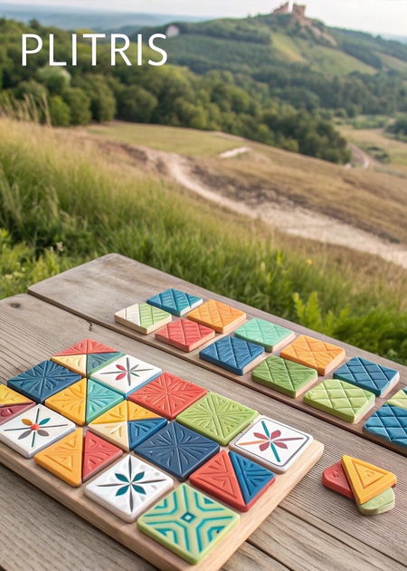 Create a cover for the brand «PLITRIS», a tile designer. Scene: Bright ceramic tiles on a wooden surface in the open air. There are green hills or mountains with a castle on the background. The lighting is soft, in the golden light of sunset. The name «PLITRIS» is in a minimalist style. Colors: earthy and bright accents. Style: natural and calm.