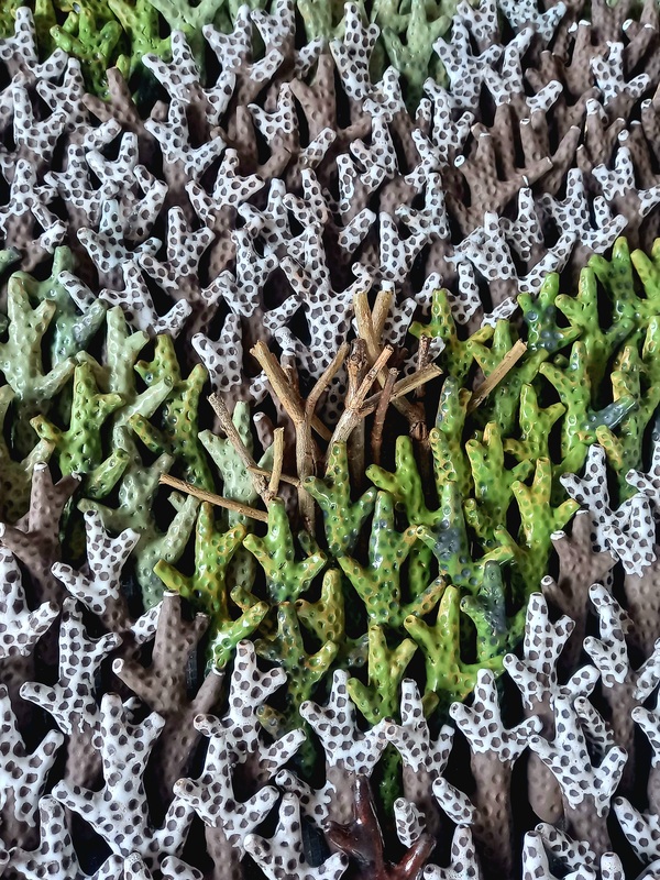 За основу композиции был выбран один элемент — ветка, коралл, знак объединяющий и водную стихию и лесную. Всего около 600 элементов, слепленных вручную. По мере продвижения книзу композиции элемент увеличивается в размере и эта растяжка создает эффект перспективы, пространства. Цвета — коричневый, белый и несколько зелёных — были выбраны для передачи состояния ранней весны, начала таяния снегов и пробуждения природы. Повторяющийся модуль, элемент часто используется мной для создания работ с единственным условием — каждая единица композиции сделана вручную, никаких форм, отминок и других способов механического повтора.