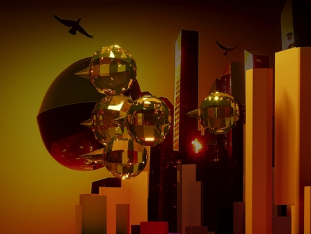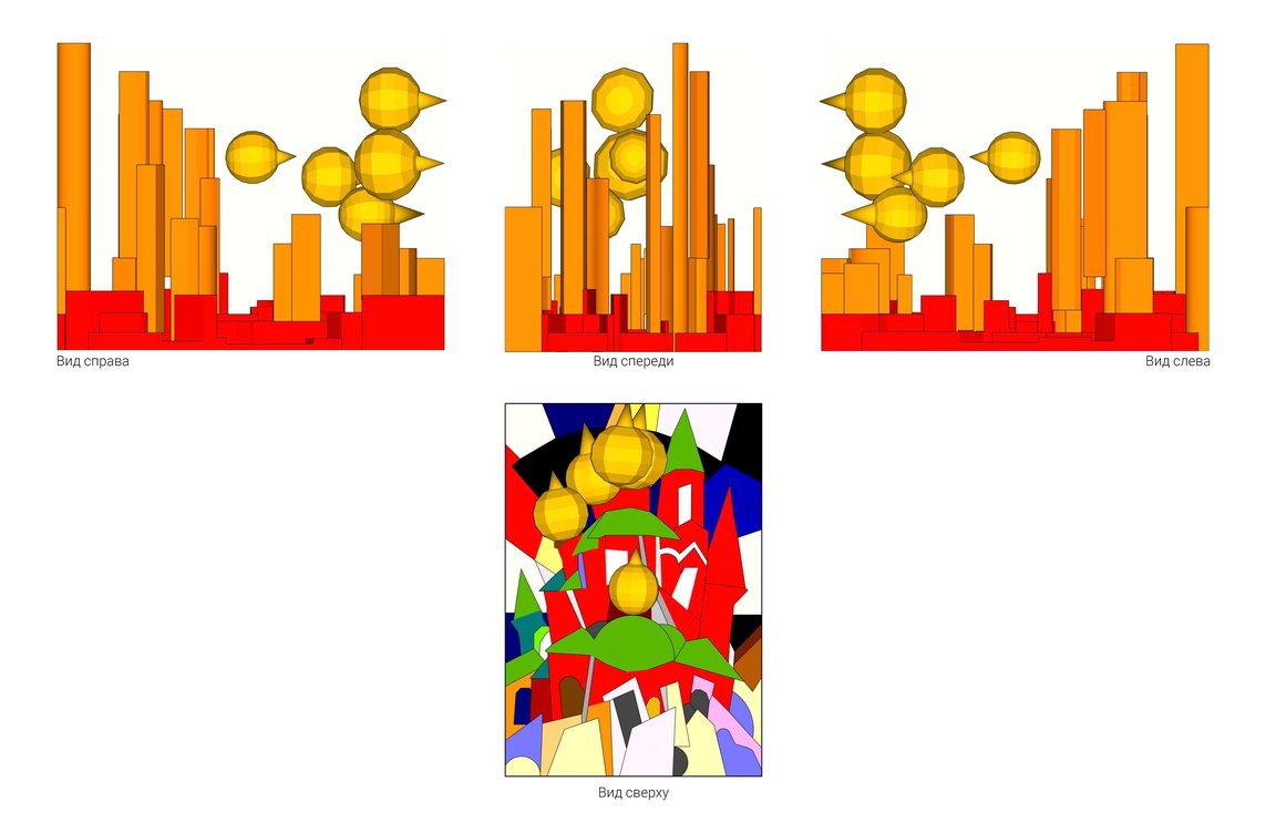 Купола символизируют «уходящую» эпоху — златоглавую Москву, а ввысь растущие оранжевые сооружения — «новую» Москву — мегаполис небоскребов.