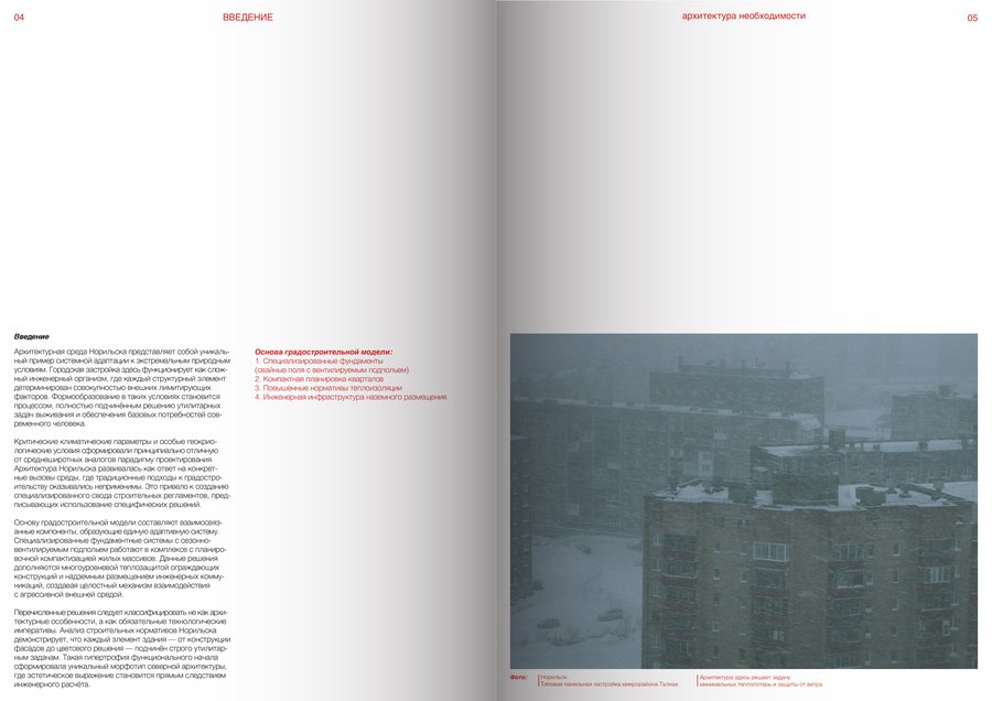 «Геометрия холода» — это журнал, исследующий, как экстремальная арктическая среда формирует уникальную архитектуру. В первом выпуске на примере Норильска я покажу, как вечная мерзлота, ветра и полярная ночь определяют каждый элемент — от свайных фундаментов и компактной застройки до психологии цвета. Это издание о том, как нужда создаёт красоту, а инженерные формулы помогают людям выживать в экстремальном климате.