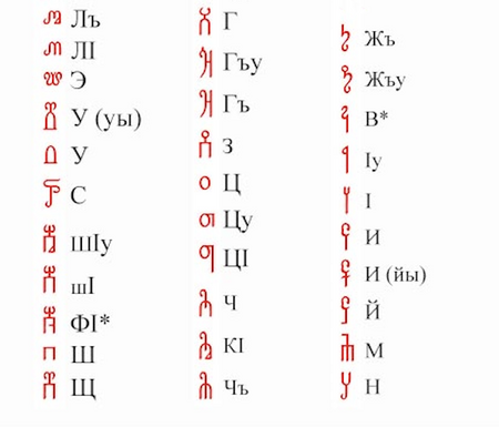Принцип отбора родовых знаков — соответствие начальной буквы фамилии и фонемы. Выбирались тамги с наиболее часто повторяющимися элементами.