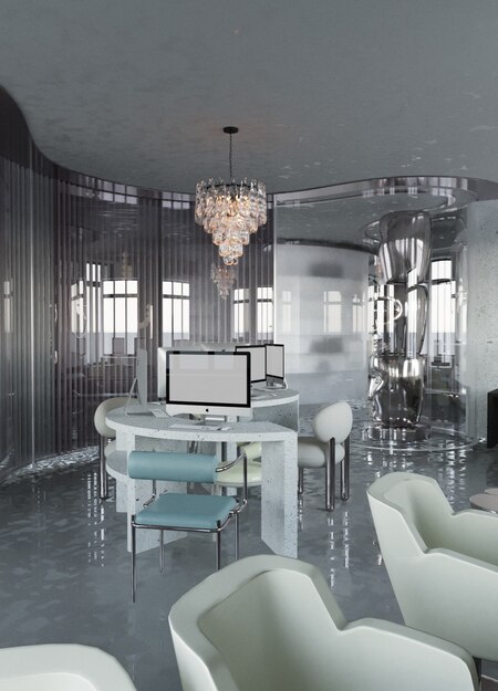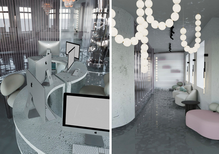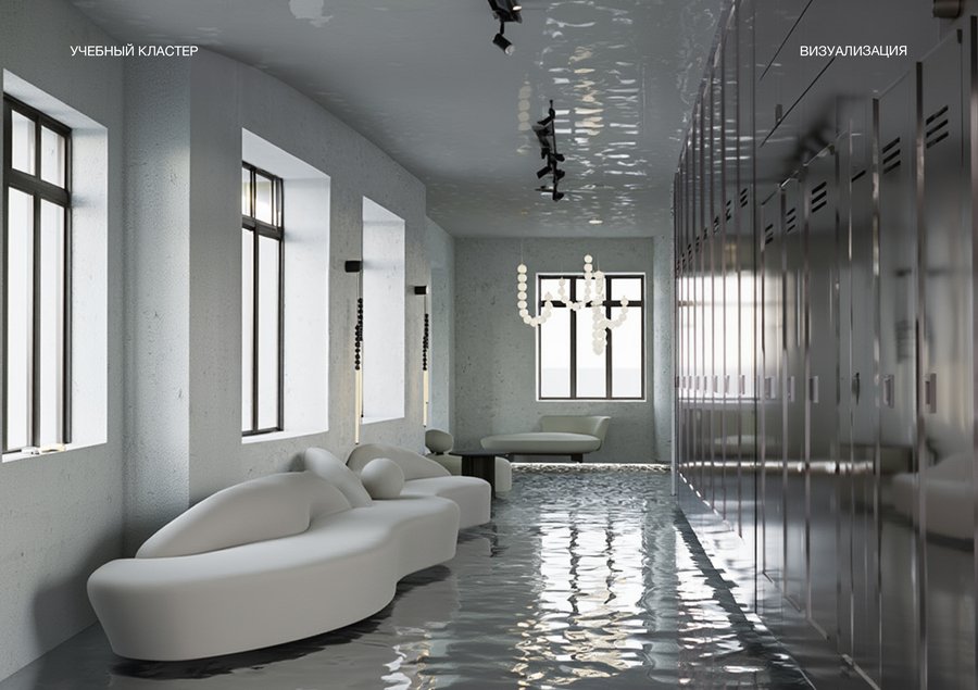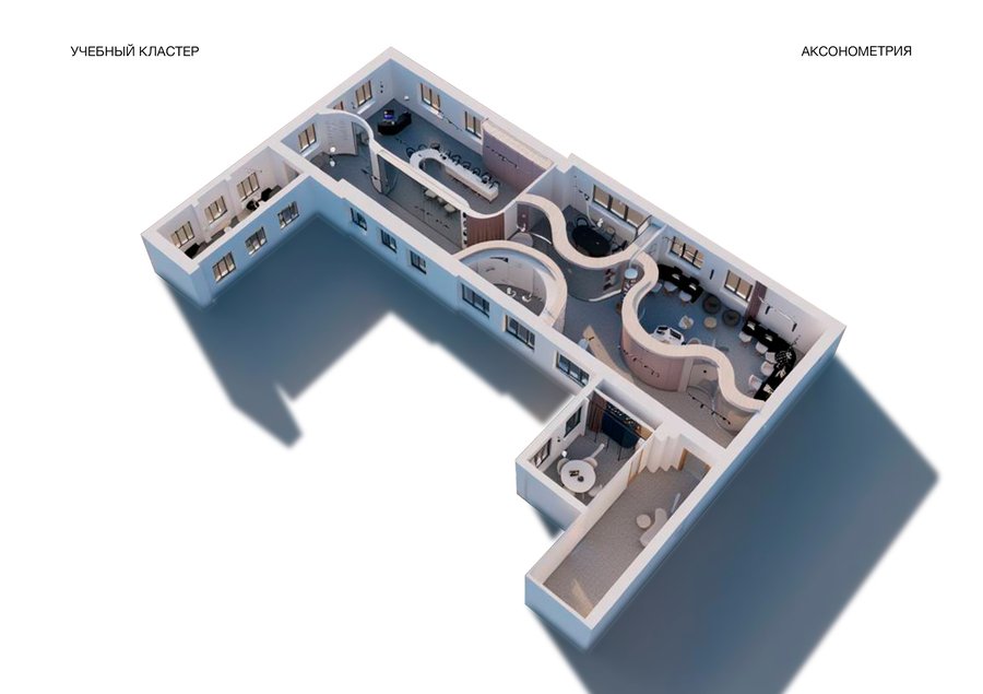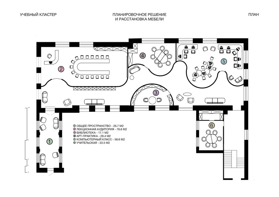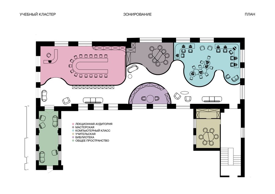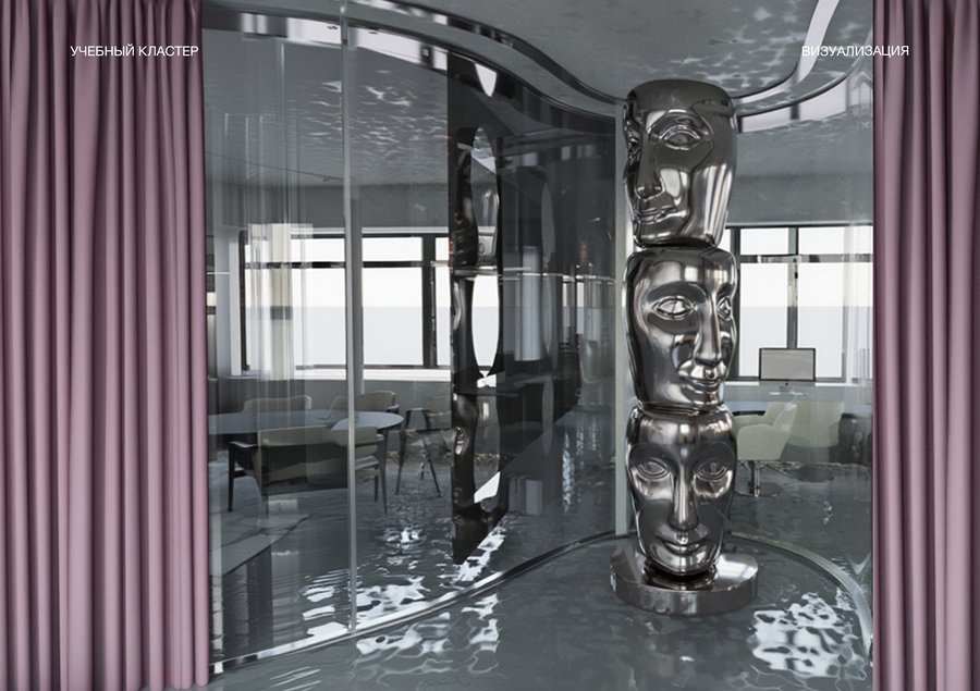 В проекте выделены несколько функциональных зон: — компьютерный класс — рассчитан на 14 человек; — переговорная и учебная — для совместной работы и презентаций, рассчитана на 24 человека; — кабинет арт-практики —рассчитан на 10 человек; — библиотека — тихое место для концентрации и индивидуальных занятий; — зона отдыха — пространство для отдыха и неформального общения.