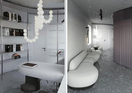 Интерьер объединяет элементы минимализма и современного дизайна. Холодные фактуры бетона и металла сочетаются с мягкими формами мебели и приглушённым освещением, создавая баланс между строгостью и уютом. Светильники в виде шаров наполняют помещения мягким рассеянным светом и добавляют динамику.