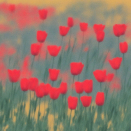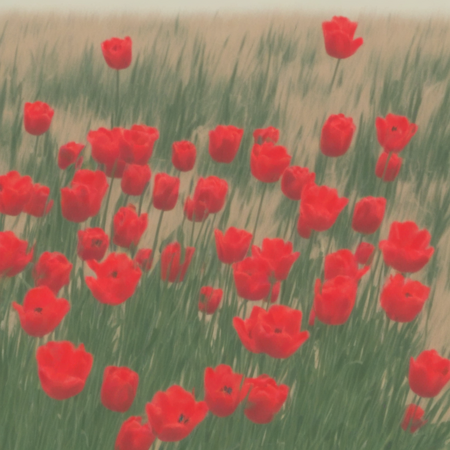 Промпт: «photo collage in alexis jamet style, draw an illustration of flower field with red tulips and green grass with yellow wheat and diffrerent magical shapes»