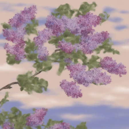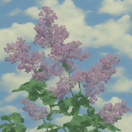Промпт: «photo collage in alexis jamet style, draw an illustration of a purple lilac branch waving in the wind against a blue sky with white clouds».