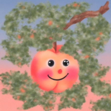 Промпт: «photo collage in alexis jamet style, draw an illustration of a smiling peach with eyes on a tree full of green leaves».