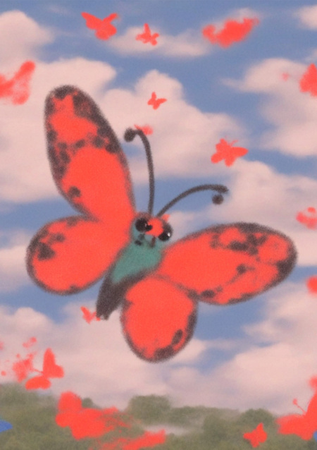 Промпт: «photo collage in alexis jamet style, draw a smiling butterfly with orange and red wings flying in among clouds».