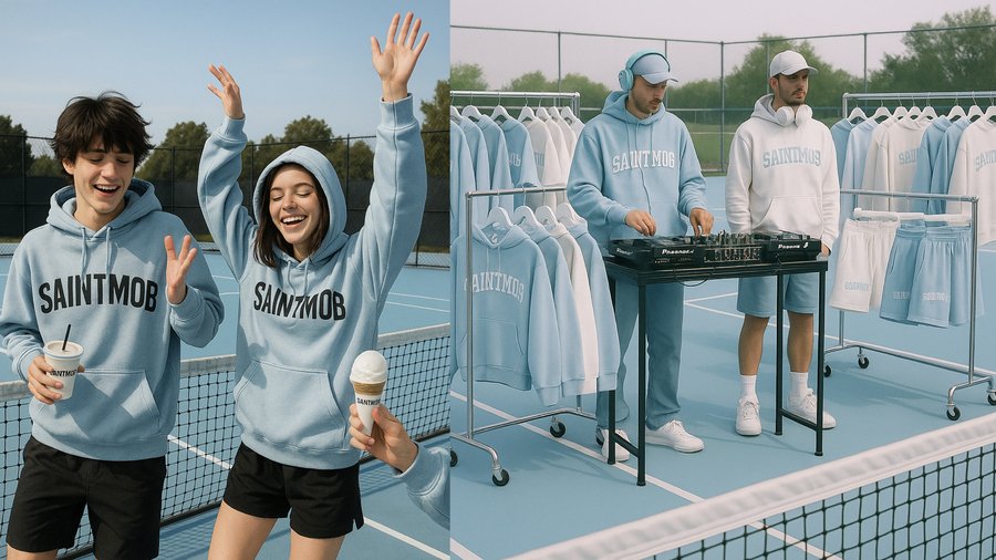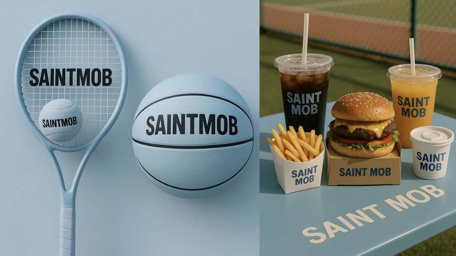 Поп-ап превращает городской спортивный корт (теннисный, баскетбольный, футбольный) в молодежную lifestyle-зону: пространство, где спорт, музыка, стиль и свобода самовыражения соединяются. Каждый элемент — от одежды до напитков — брендирован, отражая ДНК бренда Saint Mob как молодежного streetwear-бренда