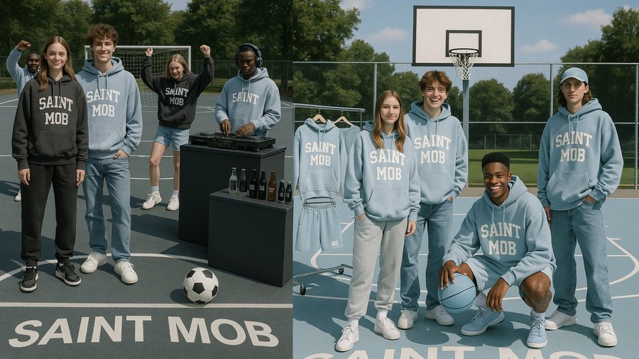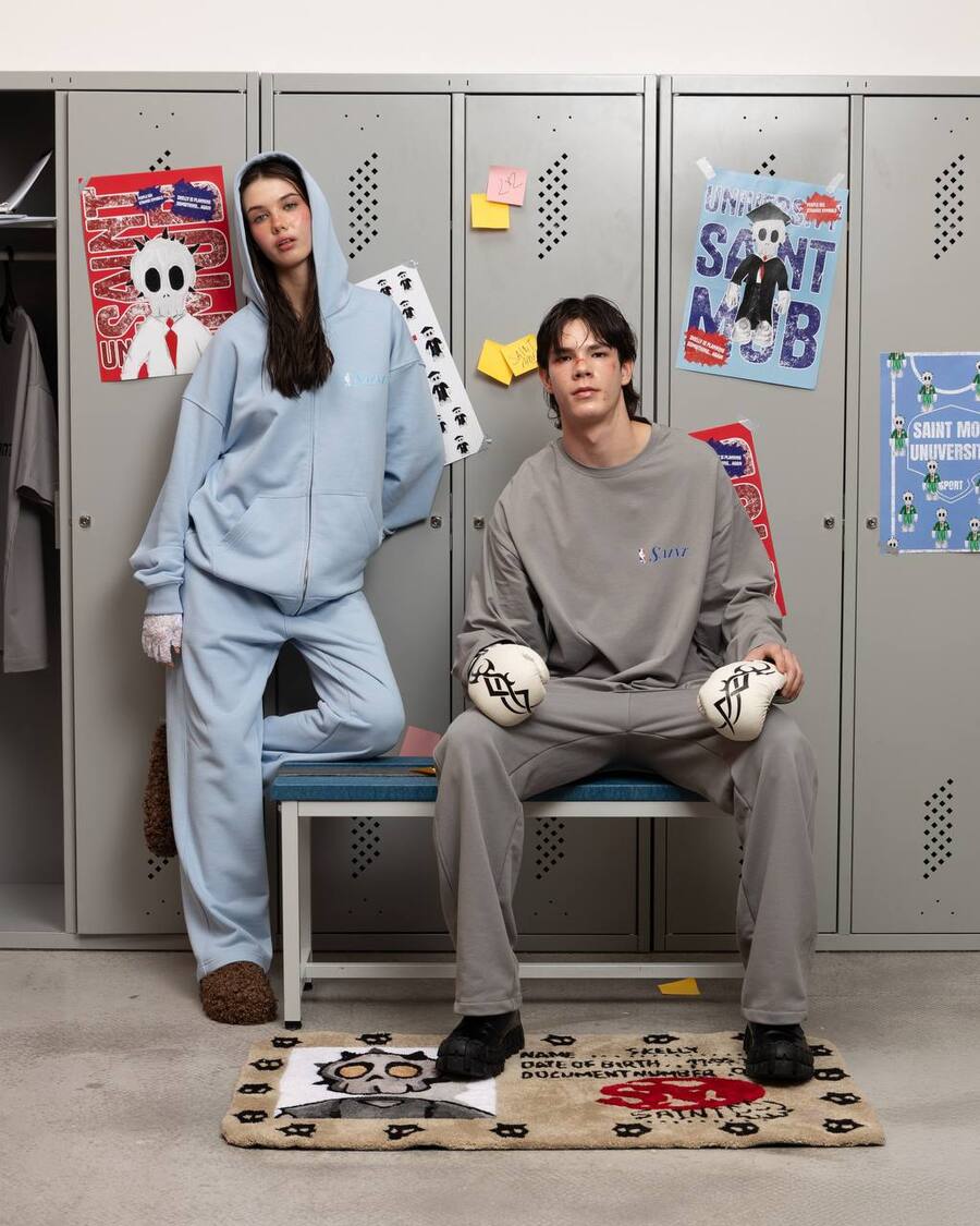 Кампейн к новой коллекции SAINT MOB UNIVERSITY'25 связан с тематикой баскетбола, с эстетикой американских университетов, название и стиль коллекции отсылают к академической эстетике, дополненной современными уличными мотивами