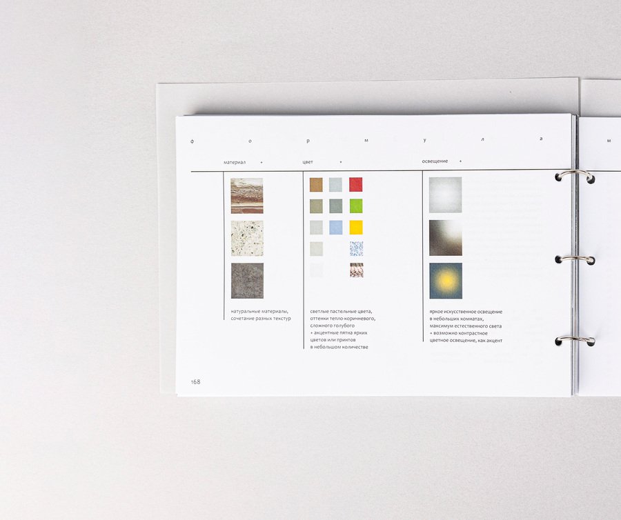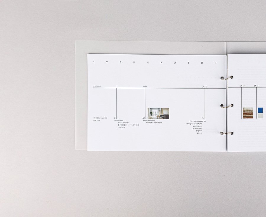 Метафора оформления книги — архитектурная папка, поэтому суперобложка выполнена из кальки, которая больше размера основного блока, а крепление — на кольца.