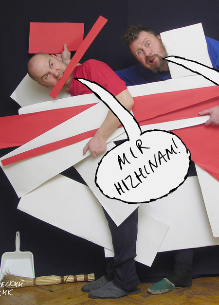 Художник Шабуров и его напарник по группе «Синие носы» Мизин демонстрируют, что как ни возьми в руки обрезки цветной бумаги, всё равно получится супрематическая композиция. Не хуже, чем у Малевича.