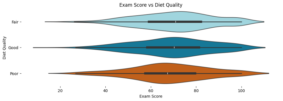 1. «Poor» Diet Quality: распределение результатов экзамена для студентов с «Poor» качеством питания сдвинуто влево (в сторону более низких оценок). «Скрипка» шире в области низких оценок, и имеет более короткий правый «хвост». Это означает, что большая часть студентов с плохим питанием имеет результаты ниже среднего, и меньше студентов с хорошими оценками.