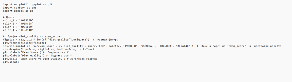 Скрипичный график визуализирует распределение результатов экзамена для каждой категории качества питания: