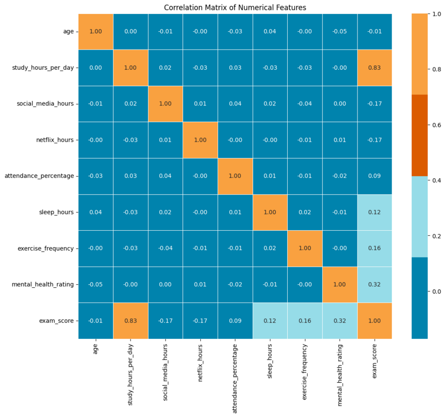 2. отрицательные корреляции: social_media_hours и exam_score: корреляция -0.17 указывает на слабую отрицательную связь. Студенты, проводящие больше времени в социальных сетях, имеют несколько более низкие оценки за экзамен.
