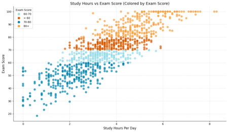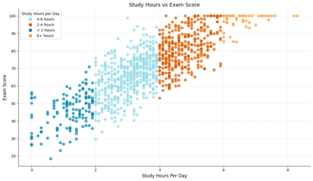 4. высокие результаты: студенты, занимающиеся 4-6 часов в день (коричневые точки) и более 6 часов в день (оранжевые точки), показывают наилучшие результаты, с плотным скоплением точек в верхней части графика (80-100 баллов). При этом максимальные результаты достигаются уже в группе 4-6 часов, а увеличение времени учебы свыше 6 часов не приводит к значительному улучшению.