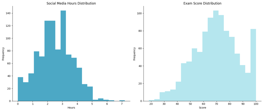 Гистограммы показывают распределения двух переменных: количества часов, проведенных в социальных сетях, и результатов экзамена.