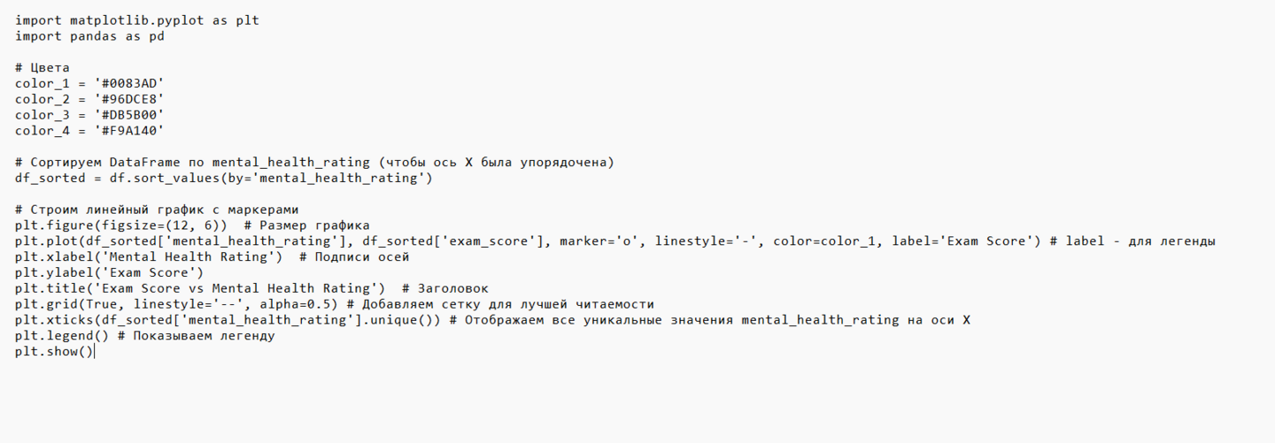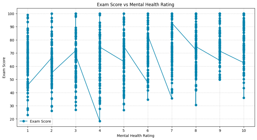 Комбинированный график (точечная диаграмма с наложенной линией) визуализирует оценку за экзамен и рейтинг психического здоровья.