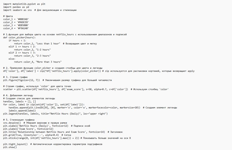 1. отрицательную корреляцию: в целом, прослеживается тенденция к снижению оценок по мере увеличения количества часов, потраченных на просмотр Netflix. Это говорит об отрицательной взаимосвязи.