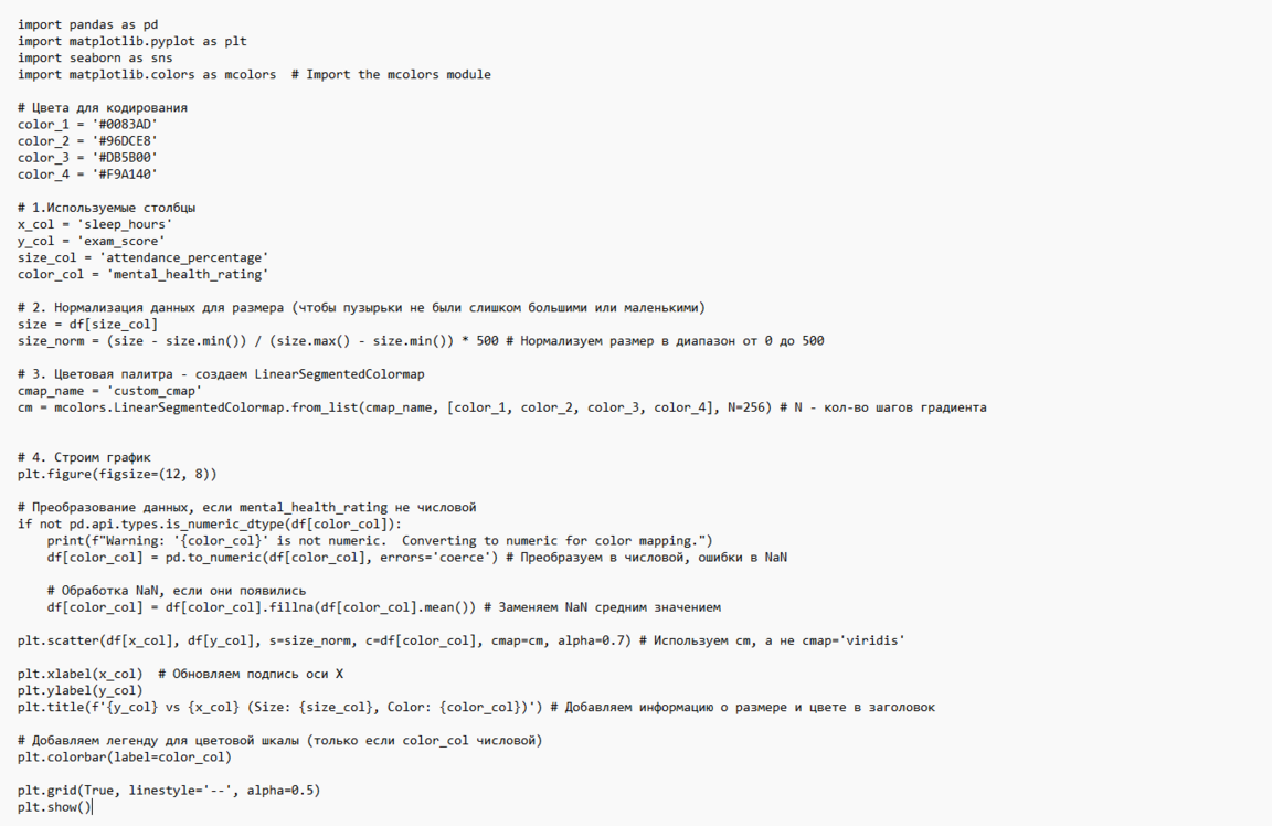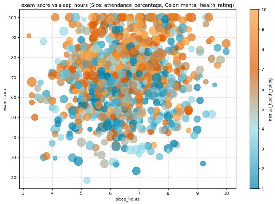 Пузырьковая диаграмма сравнивает результат экзамена и количество часов сна, где размер кодирует процент посещаемости, а цвет — рейтинг психического здоровья.