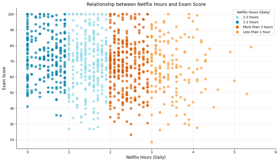 4. группы с умеренным просмотром: группы студентов, которые смотрят Netflix 1-2 часа (синие точки) и 2-3 часа (голубые точки), распределены более равномерно, но также в основном находятся в диапазоне оценок от 50 до 80.