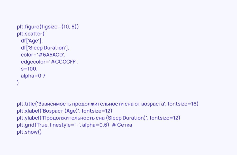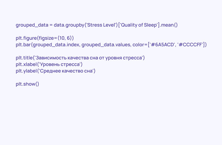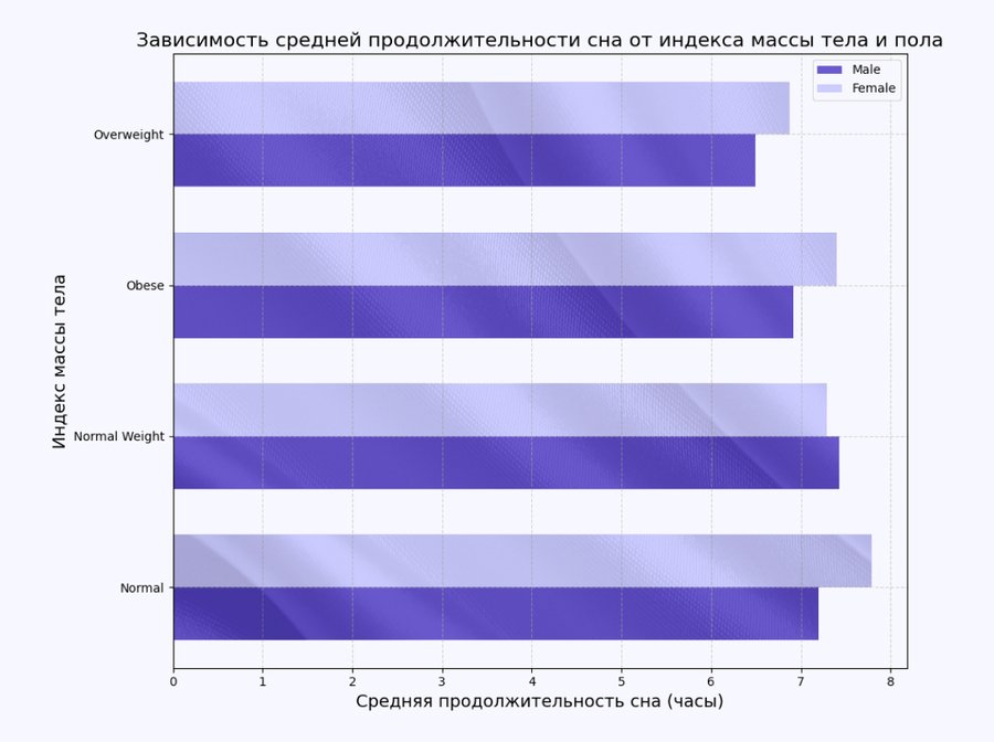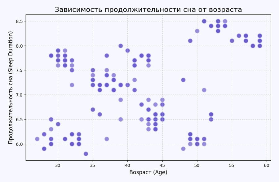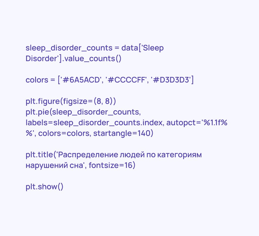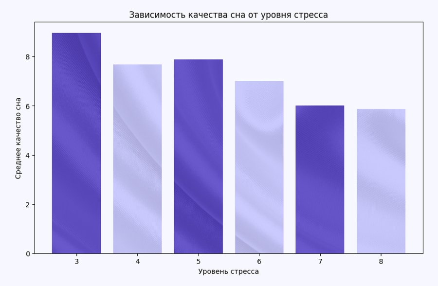 Для анализа я использовала датасет «Sleep health and lifestyle dataset», который нашла на сайте kaggle.соm и на основе которого сделала круговые (для визуализации процентного соотношения), столбчатые (для сравнения значений по категориям) и точечные (для определения связи между показателями) графики и диаграммы.