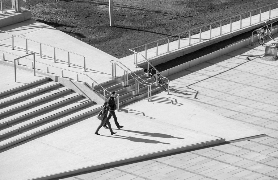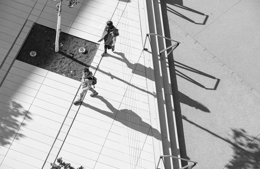Стеклянный переход между зданиями визуально связывает две стороны улицы, делая их своеобразной частью территории кампуса.