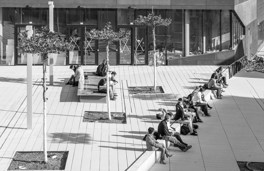 Общественные пространства на территории кампуса располагаются между учебными корпусами, таким образом функционально и визуально объединяя стилистически разные здания.