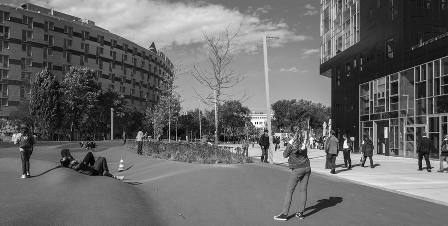 Пешеходными досуговыми зонами заполнено все пространство между корпусами, таким образом они связывают между собой здания, скрывая архитектурные противоречия.