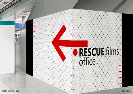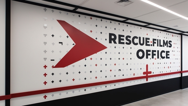 Сгенерировано в https://app.leonardo.ai/ Текстовое описание «A modern, minimalist office interior with a directional wall graphic. The wall is white with a repeating pattern of small black squares, gray circles, and red plus signs. A large, solid red arrow points left, leading to the text „RESCUE.films office“ in bold, black sans-serif font. The arrow is placed on top of a red dot. The wall is framed by two solid black borders on each side with horizontal red lines, and the overall space is modern and clean, with visible ceiling and floor details. The pattern background adds a playful contrast to the bold red arrow and text.» Текст сформулирован https://chatgptchatapp.com/ на основе описания исходного изображения (картинка слева).