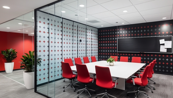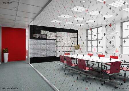 Сгенерировано в https://app.leonardo.ai/ Текстовое описание «A modern office conference room with a large glass wall separating it from another area. The conference room features a long white rectangular table surrounded by several red office chairs with black armrests. The glass wall has a repeating pattern of small black squares, gray circles and red plus signs. On the wall in the back of the conference room there is a large, black pin board covered in notes, and the windows also have the repeating pattern. There is a plant on the table and a few in a white pots on the left. The room is lit with recessed ceiling lights and has a gray carpet. The overall feeling of the space is a modern, functional office with a distinctive patterned overlay. In the background on the left is a red wall.» Текст сформулирован https://chatgptchatapp.com/ на основе описания исходного изображения (картинка слева).