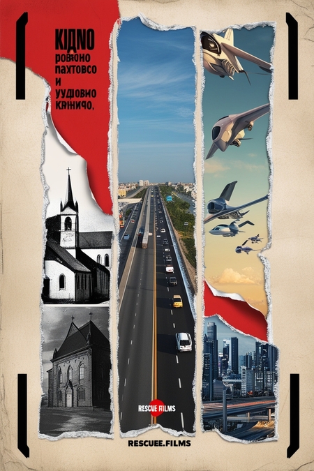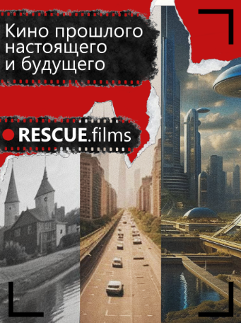 Сгенерировано в https://app.leonardo.ai/ Текстовое описание «A poster-style image with a layered, collage-like design. The background is composed of three vertical panels showing different time periods. From left to right: a black and white image of an old town with a church, a color photograph of a busy highway, and a futuristic cityscape with flying vehicles. These panels are partly obscured by ripped edges and a red overlay along the top. On the red overlay are the words „Кино прошлого настоящего и будущего“ in a black sans-serif font, and below that, a black band with white text and a red dot: ‘RESCUE.films’. The whole design has a textured, slightly distressed look and is framed with black ‘L’ shaped brackets on the corners.» Текст сформулирован https://chatgptchatapp.com/ на основе описания исходного изображения (картинка слева).