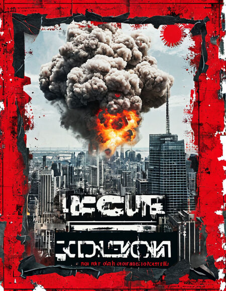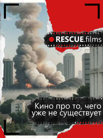 Сгенерировано в https://shedevrum.ai/ Текстовое описание «A distressed-style poster featuring a photo of a large explosion with billowing smoke and tall city buildings in the background. The image is overlaid with red sections that appear torn or ripped, creating a collage effect. The ‘RESCUE.films’ logo appears in a black box with white text and a red dot over the torn red section. Below the image, the text „Кино про то, чего уже не существует“ is present in black text within another torn-edged section. The poster is framed by black L-shaped brackets in the corners.» Текст сформулирован https://chatgptchatapp.com/ на основе описания исходного изображения (картинка слева).
