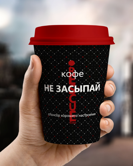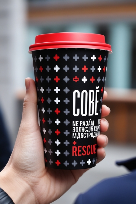 Сгенерировано в https://app.leonardo.ai/ Текстовое описание «A close-up shot of a hand holding a disposable coffee cup. The cup has a black background with a repeating pattern of small white squares, gray circles, and red plus signs. The cup has a red lid. The text „кофе“ appears vertically and to the right is the text ‘НЕ ЗАСЫПАЙ’ and below that, ‘спонсор хорошего настроения’ all in white text, with the ‘RESCUE’ text in red, with a red dot above it. The background is slightly blurred, suggesting an urban setting.» Текст сформулирован https://chatgptchatapp.com/ на основе описания исходного изображения (картинка слева).