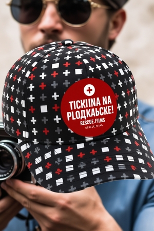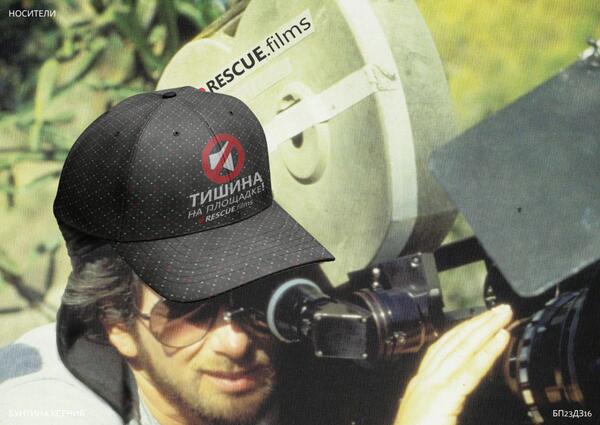 Сгенерировано в https://app.leonardo.ai/ Текстовое описание «A baseball cap with a black background and a repeating pattern of small white squares, gray circles, and red plus signs, is positioned prominently in the foreground. The cap also displays a red circle with a white graphic and the text ‘ТИШИНА НА ПЛОЩАДКЕ! ’ in white, with a smaller ‘RESCUE.films’ underneath it. The background is a slightly out-of-focus image of a person wearing sunglasses and using an old-fashioned film camera. The cap appears to be superimposed onto the scene, showcasing it as a piece of merchandise or branding.» Текст сформулирован https://chatgptchatapp.com/ на основе описания исходного изображения (картинка слева).