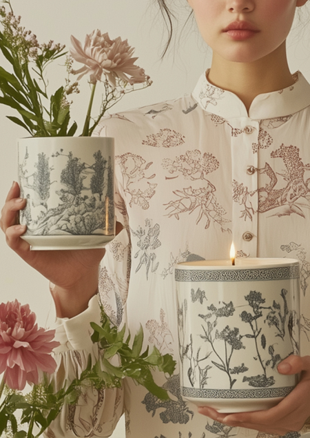 - fashion shoot with an Asian model holding a candle featuring intricate traditional Chinese patterns on a glossy ceramic surface. The candle displays classic Chinese motifs, including delicate floral designs, clouds, and symbolic patterns in deep red (#a10b2b), vibrant pink (#ff5ec4), dark indigo (#2d0060), and bright blue (#2830da), reflecting the elegance of ancient Chinese craftsmanship. A lush plant grows from the candle, entwining around the model and blooming vibrantly. The model wears an oversized, flowing blouse with airy fabric, designed as part of the 'Moyo' brand, adorned with subtle Chinese patterns and floral elements. She pairs the look with high-platform boots. White background with soft, diffused lighting for a refined, dreamlike aesthetic, showcasing the intricate textures and vibrant details --ar 16:9 --sref 2920189809