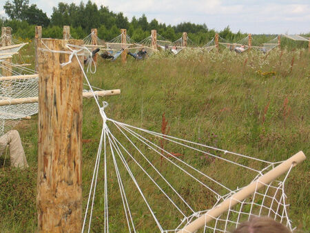 «Второй проект — сенная башня, она напоминала древневавилонскую. По технологии строительства она близка сельскому человеку: нужно было косить, стоговать… Поставили ее на том же месте, где были снеговики.» — рассказывает Николай Полисский в интервью*. Потом был акведук из снега, телебашня, сплетенная из молодого березняка, маяк из огромных и одновременно невесомых переплетенных бревен, шуточная реконструкция «Грачи прилетели».