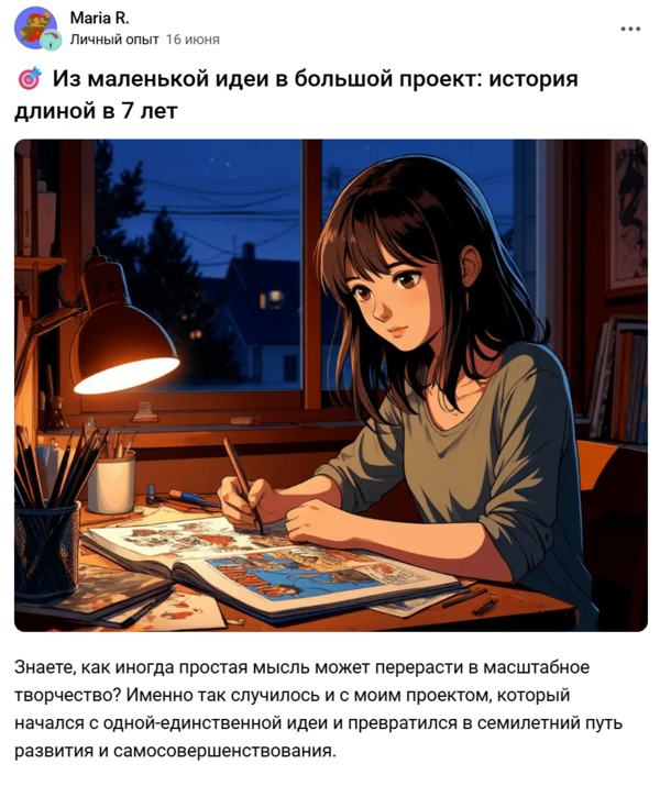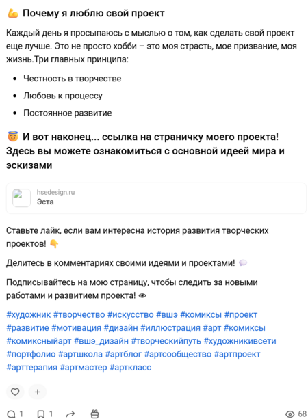 Пост, выложенный на сайте VC.ru оказался весьма успешен с точки зрения показателя вовлечённости и собрал 68 активных просмотров, что составило около 17,5% от всех показов (их было 388), а также 1 комментарий. Статья была полностью написана с помощью ИИ от Яндекса с использованием промпта, в котором ключевым моментом был захват читательского внимания. Ссылка на статью: https://vc.ru/life/2045767-kak-iz-idei-sozdat-proekt-semeletnii-put-k-uspekhu