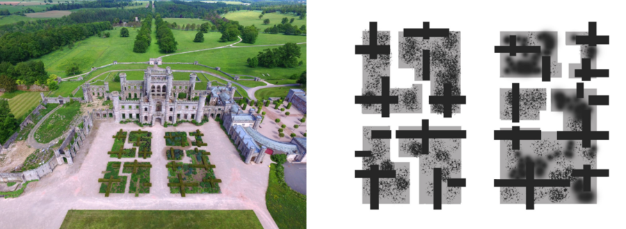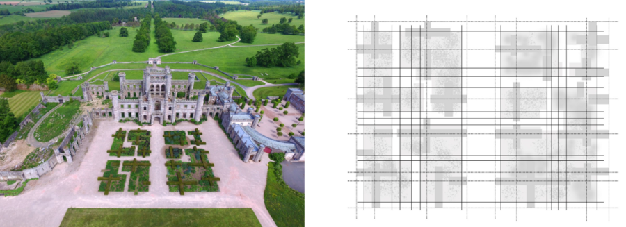 Сетка садов Lowther Castle более прямолинейная, но даже в ней прослеживается хулиганский дух Дэна Пирсона, так как некоторые элементы выбиваются из параллельных линий.