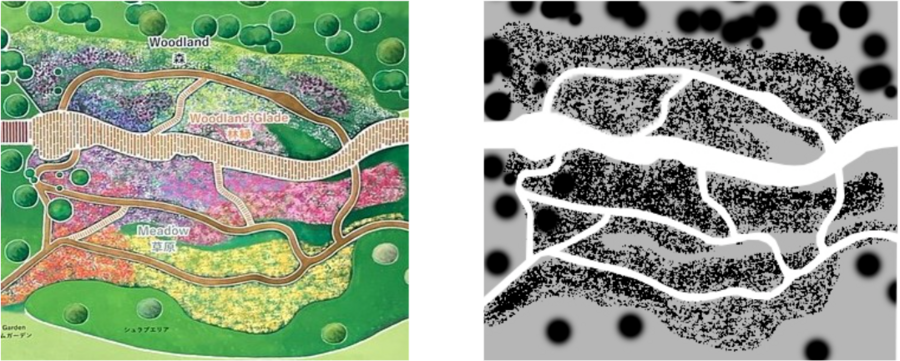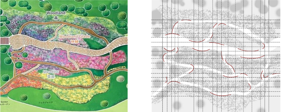 Сетка и схема Tokachi Millennium Forest основана на естественных топографических линиях долины. Деревья высажены не по рядам, а по волнообразным ритмам, соответствующим движению ветра. Но тем не менее, изгибы дорожек часто сопрягаются на одних линиях.
