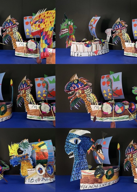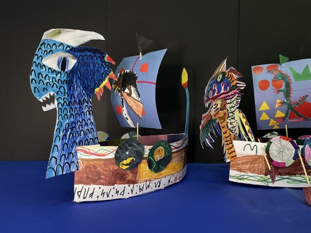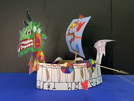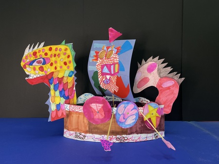 Интенсив состоит из 4-х занятий, где каждое посвящено созданию отдельного элемента корабля: корпуса, паруса, драконьей головы (носовой и кормовой фигуры) и декораций. Предварительно я погружаю ребят в историю Средневековья и Викингов, наполняю их сознание интересными и завораживающими фактами, что напрямую влияет на работу их фантазии в работе.